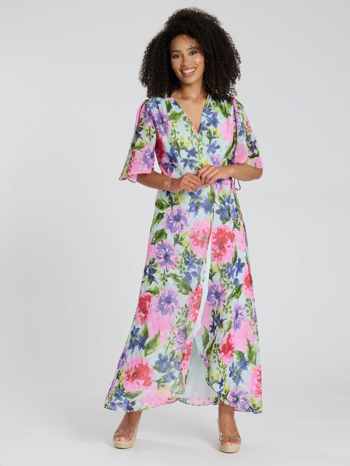 Vibrant multicolor floral print midi dress with a wrap-around tie closure and short sleeves. Perfect for summer events or casual outings.