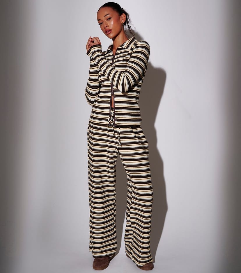 Playful wide-leg trousers in a tactile towelling fabric. Features a black and yellow striped pattern for a vibrant look. Ideal for casual and errand days.