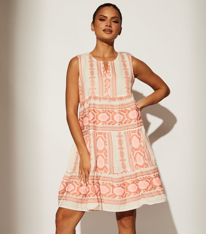 The South Beach Pink Jacquard Mini Dress is available in sizes 12, 14, 16.