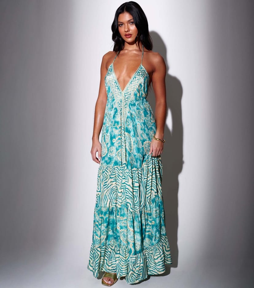 Embrace bohemian vibes with this striking backless maxi dress by South Beach featuring a vibrant turquoise print. Hanging from skinny halter neck straps with a tiered skirt, it's a winning pick for beach getaways or garden parties.