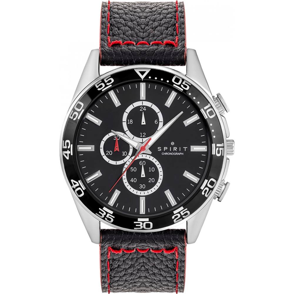Stylish black quartz watch from Spirit, featuring a black dial, silver-tone accents, and a black leather strap with red stitching. Ideal for a modern and sophisticated look.