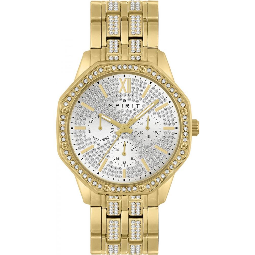 Luxurious gold quartz watch from Spirit, featuring a diamond-encrusted face and gold-tone metal bracelet. Ideal for formal occasions or as a statement piece.