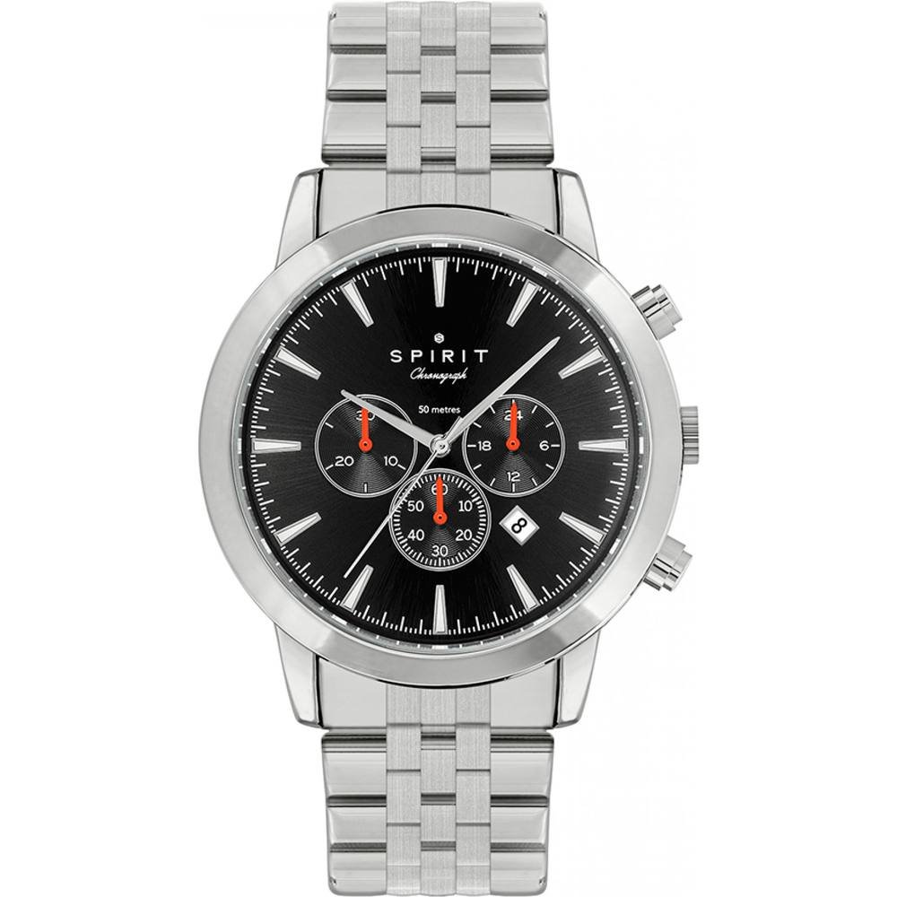 Sleek silver Spirit watch with a black dial and orange chronograph hands. Features a 48mm case and stainless steel bracelet, perfect for a modern and sophisticated look.
