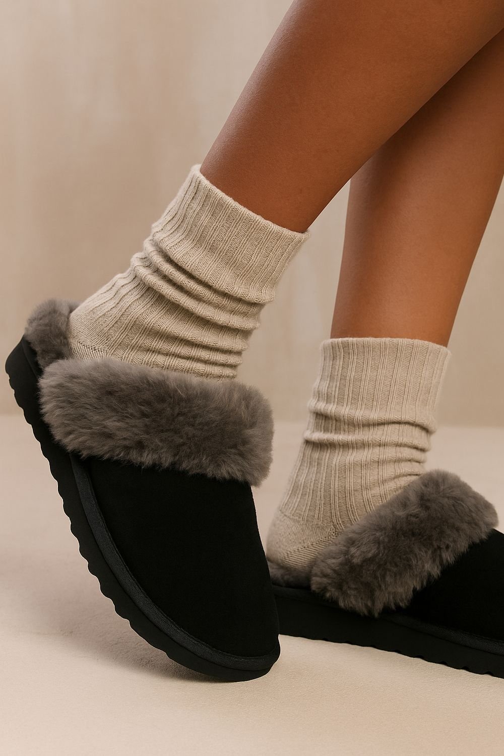 Experience exceptional comfort with these premium shearling-lined mule slippers, crafted from soft natural suede for a luxurious feel. The plush shearling interior provides superb warmth and breathability, making them ideal for all-season wear.