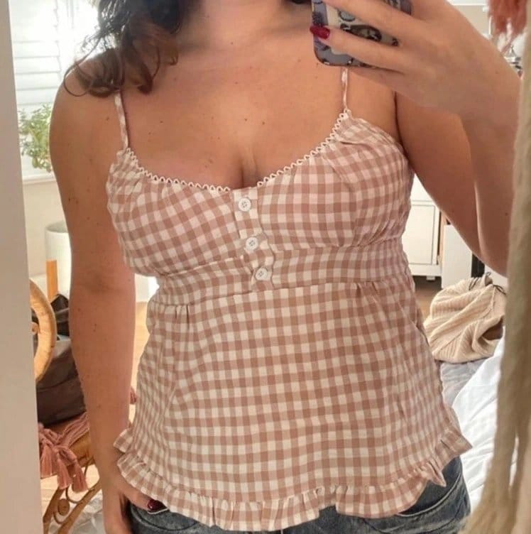 Charming gingham summer top in beige and red with a sweet ruffled hem and button-front detail. Ideal for festivals and casual outings.