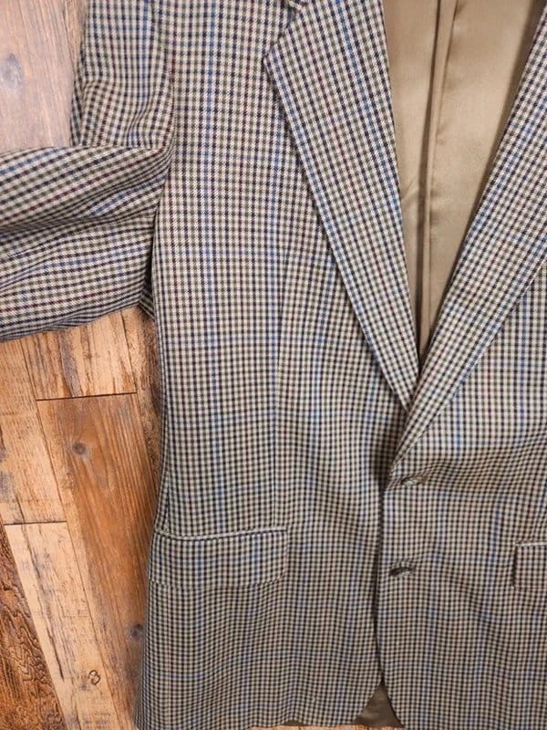 Timeless vintage blazer in a beige check pattern. Made from 100% pure new wool, this jacket features a notch lapel, two-button front, and flap pockets. Perfect for a classic, tailored look.
