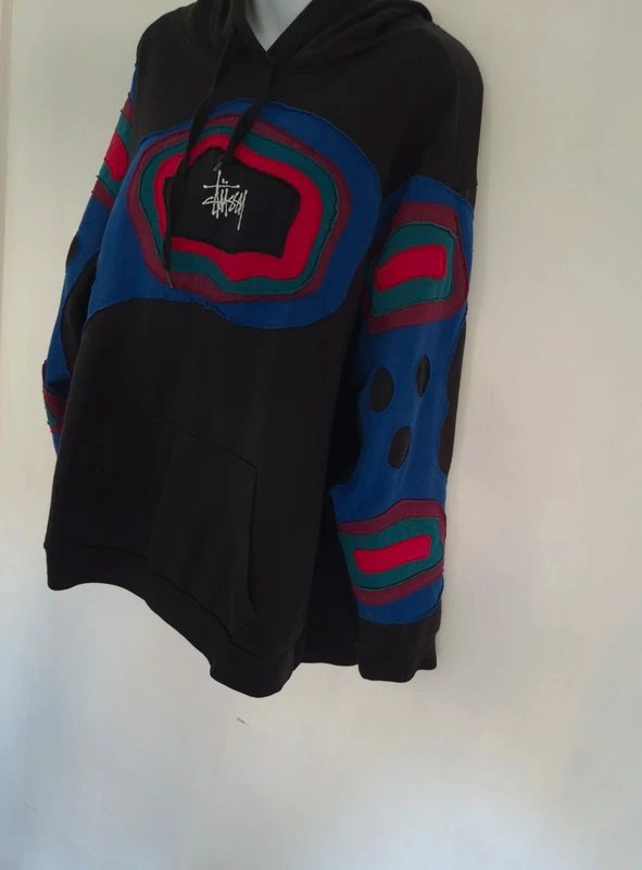 Designed in a moody mix of deep burgundy, teal, and royal blue over a black base, this heavy cotton hoodie features an incredible, multi-layered raw-edge applique design that gives it a high-end DIY aesthetic. With the iconic stock logo embroidered on the chest and a massive version on the back, this isn't your average hoodie.