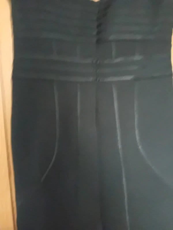 Sleek black stretch fabric dress with corset-style piping and a fully lined interior. Perfect for evening events or special occasions.
