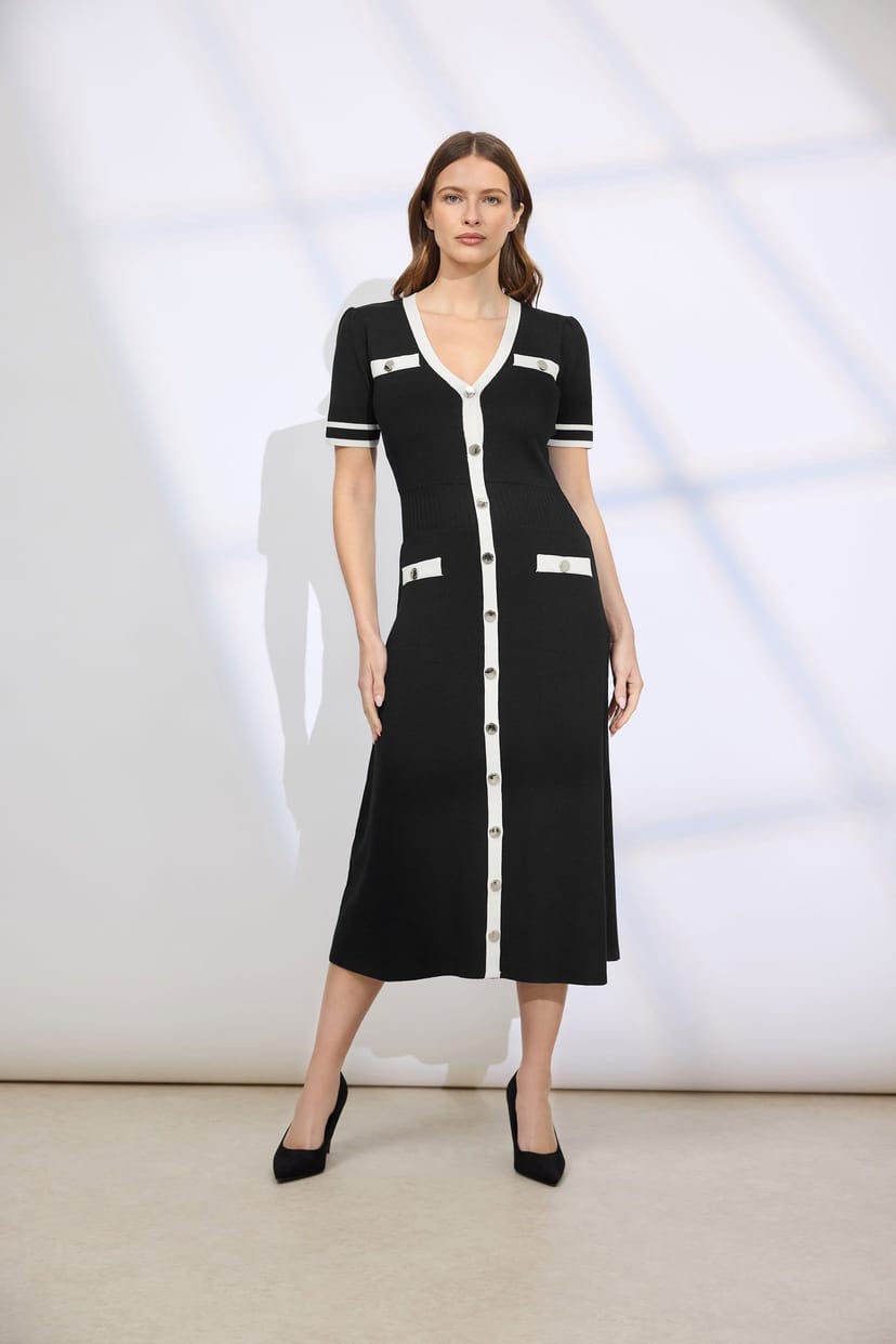 Elegant contrast knitted midi dress in black and white. Features button detailing, short sleeves, and a midi length. Perfect for formal events or evening outings.