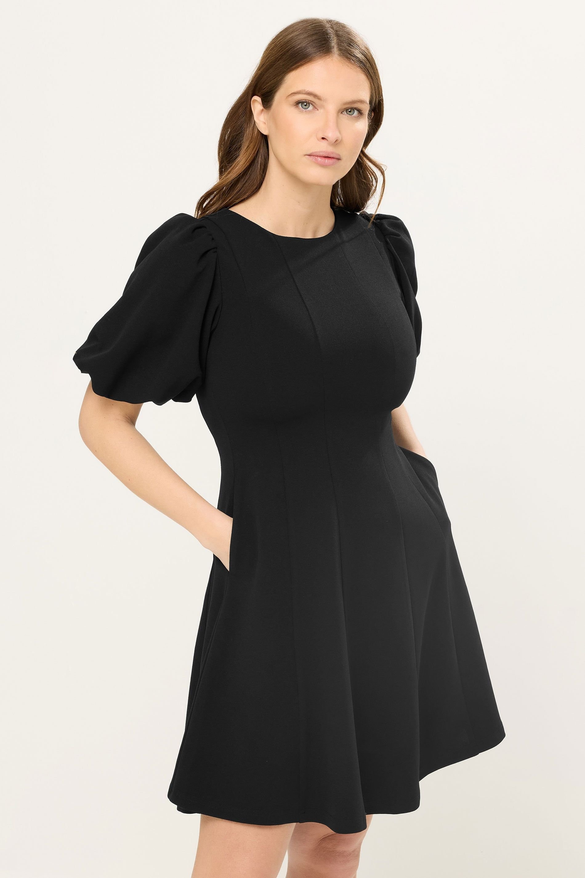 Elegant black woven mini dress featuring a panelled front, short puff sleeves, and a fit and flare silhouette. Ideal for evening events or casual outings.