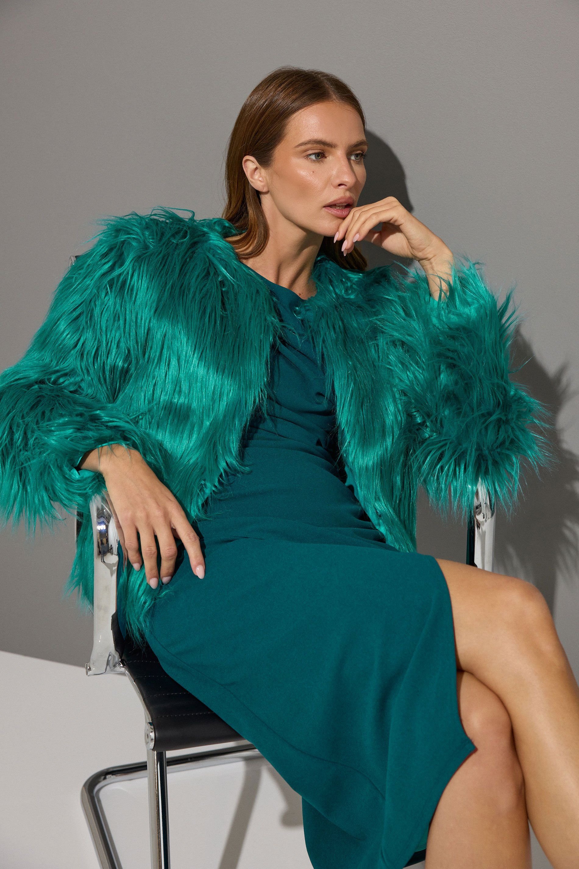 Luxurious collarless coat crafted from faux fur in a vibrant teal hue. Features long sleeves and concealed hook and eye fastenings. Ideal for adding a bold statement to your outerwear collection.