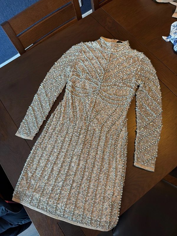 The Starlet Embellished Long Sleeve Mini Dress in Beige is available in sizes S.