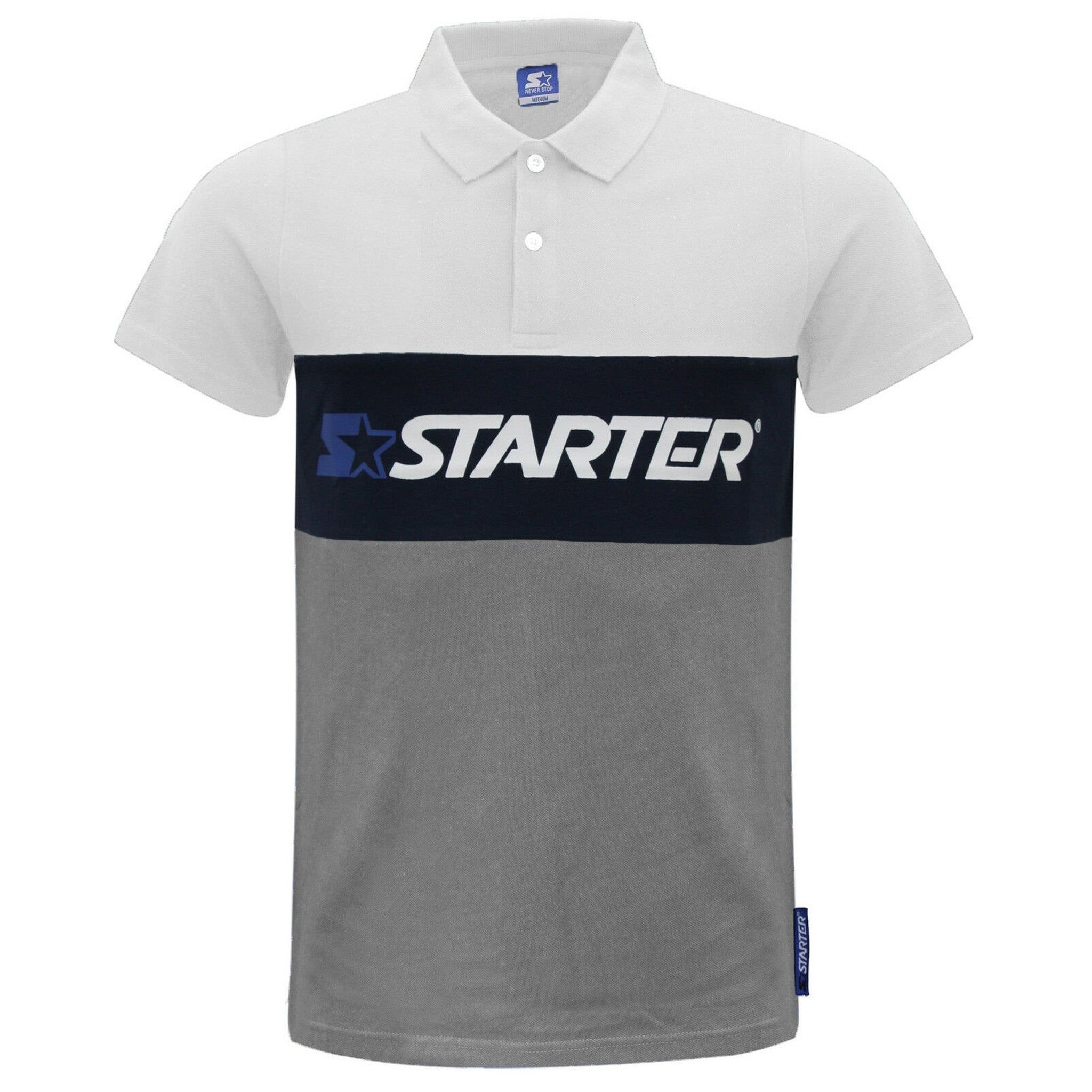 Modern sporty polo shirt in white with a bold navy blue and grey block design across the chest. Featuring the iconic Starter logo, this shirt combines comfort with a stylish athletic aesthetic.