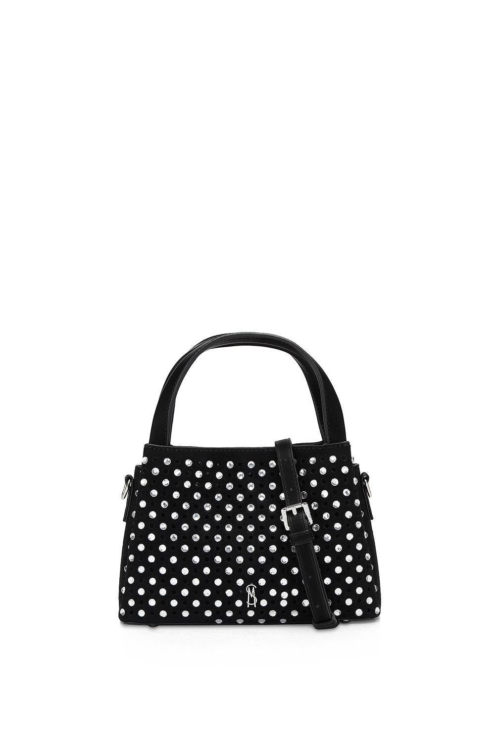 Striking black handbag with a playful design. Crafted from synthetic materials, it features shimmering studs for a captivating look. Perfect for adding a touch of sparkle to any outfit.