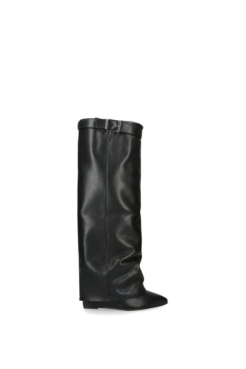 Sleek black leather high leg boots with a subtle buckle detail at the top. The low heel ensures comfortable wear while maintaining a chic silhouette. Perfect for adding a touch of elegance to any outfit.