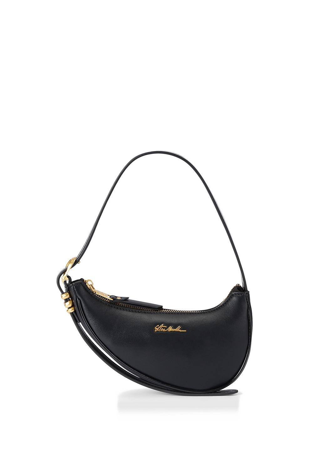Sleek and stylish black handbag crafted from smooth synthetic material. Features a crescent shape, elegant gold-tone hardware, and a convenient zip closure. Ideal for adding a touch of sophistication to any outfit.