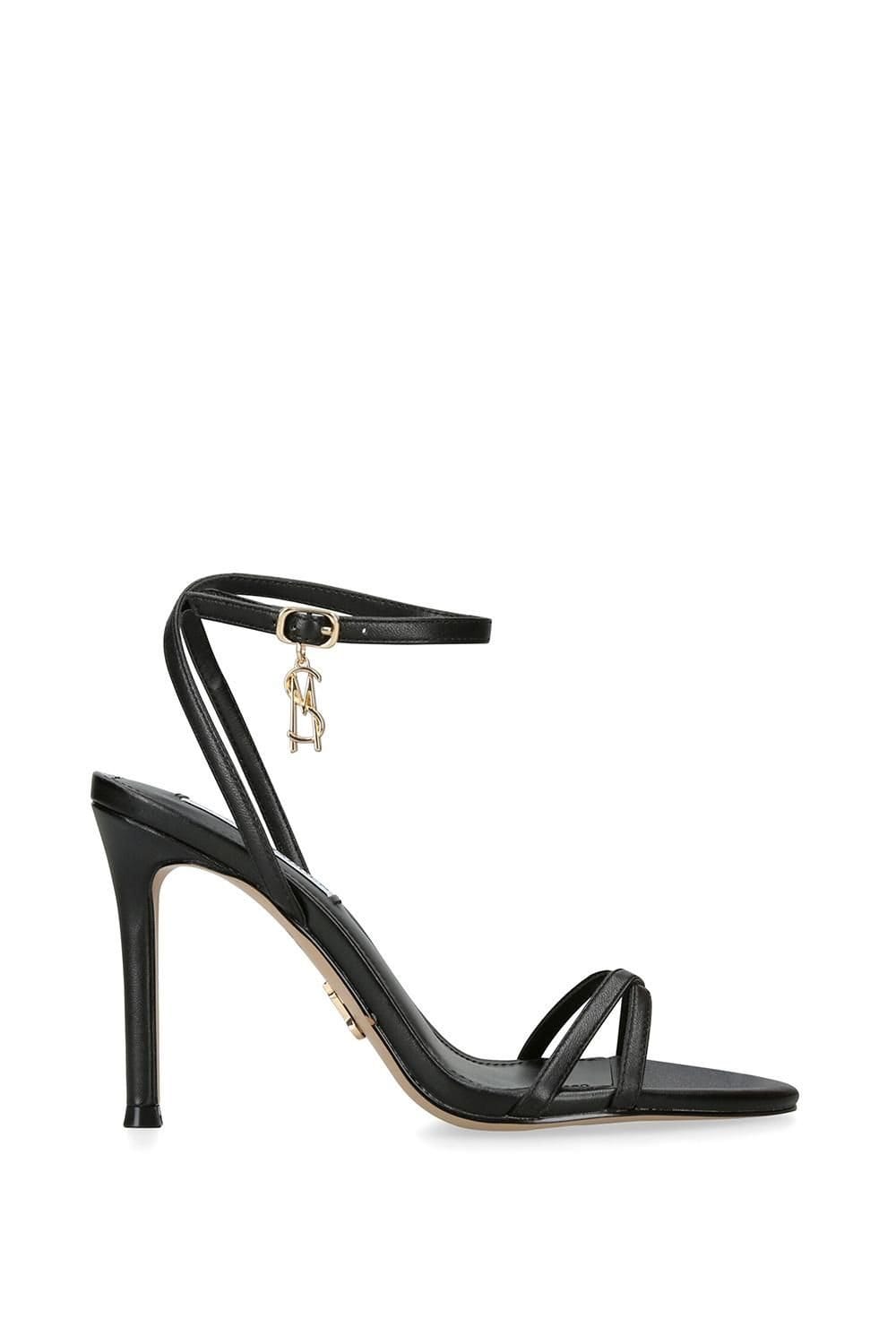 Elegant black leather heels with a sleek design. Features delicate, slender straps and a subtle gold-tone charm for a touch of glamour. Perfect for evening events or special occasions.
