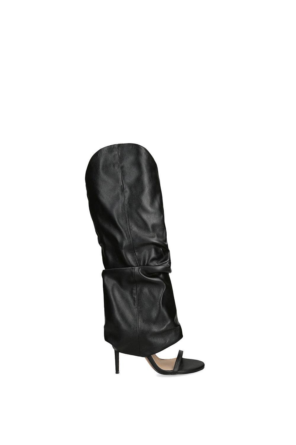 Striking black synthetic boots with a tall, slouchy silhouette. The open toe and single strap detail add a modern twist to the classic high boot. Perfect for casual wear.