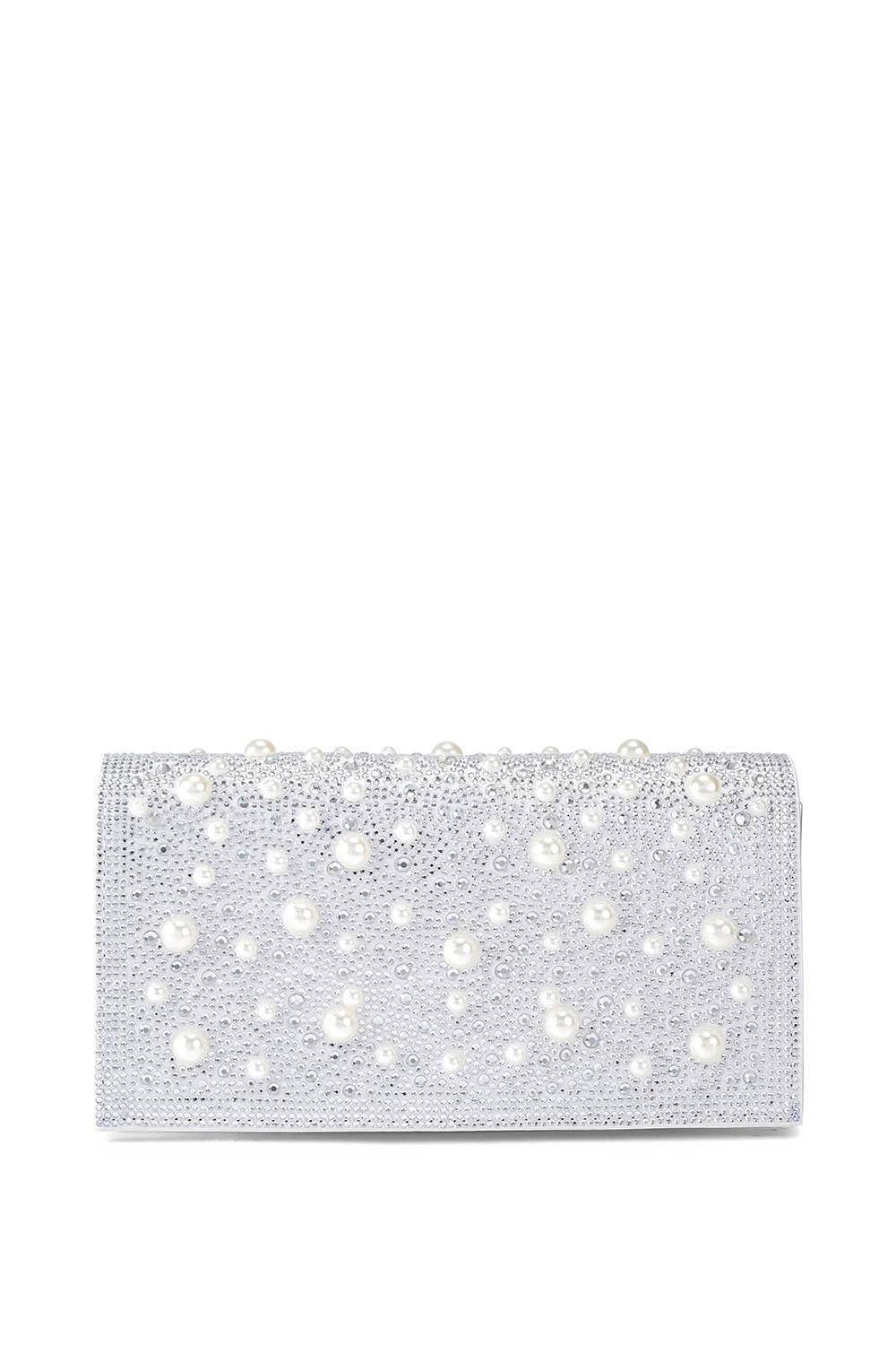Glamorous silver synthetic handbag adorned with dazzling crystals and pearl embellishments. A compact and stylish accessory perfect for adding a touch of luxury to any outfit.
