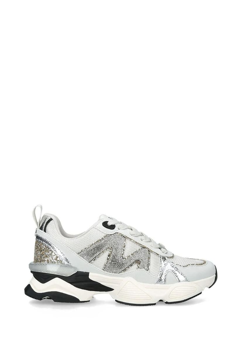 Chic white fabric trainers with silver glitter accents from Steve Madden. These stylish sneakers feature a supportive 45 mm heel and a playful design perfect for casual wear.