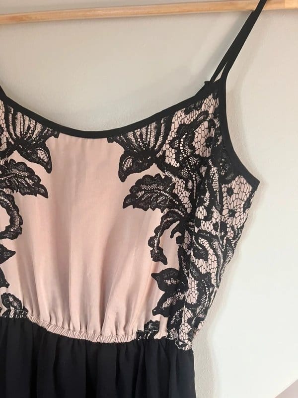 Elevate your wardrobe with this stunning mini dress featuring a delicate light pink and black floral lace bodice. The intricate lace detailing adds a touch of elegance and sophistication, perfect for evening events or date nights.