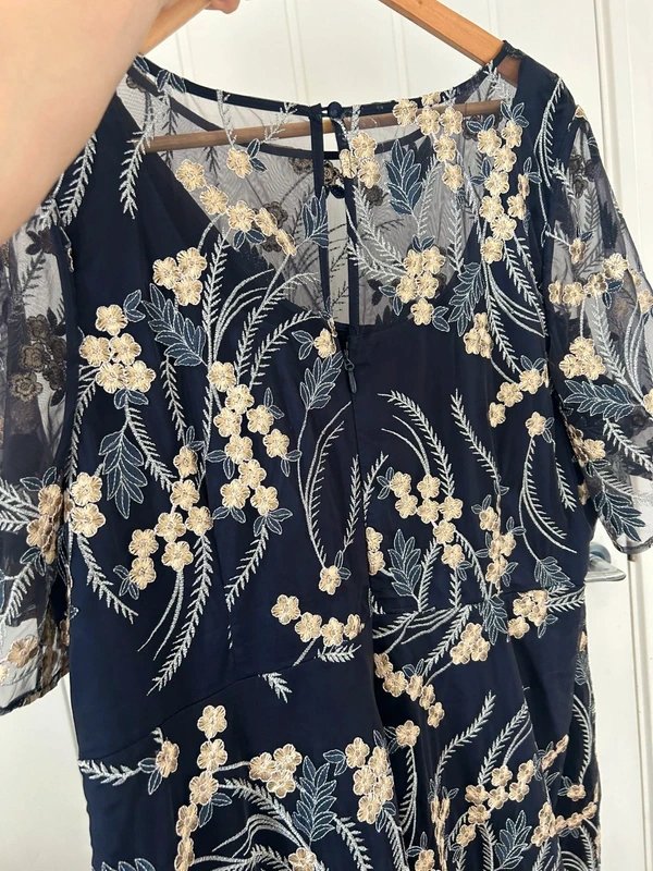 The Studio 8 Navy Embroidered Mesh Dress with Floral Pattern is ideal for evening, formal, party.