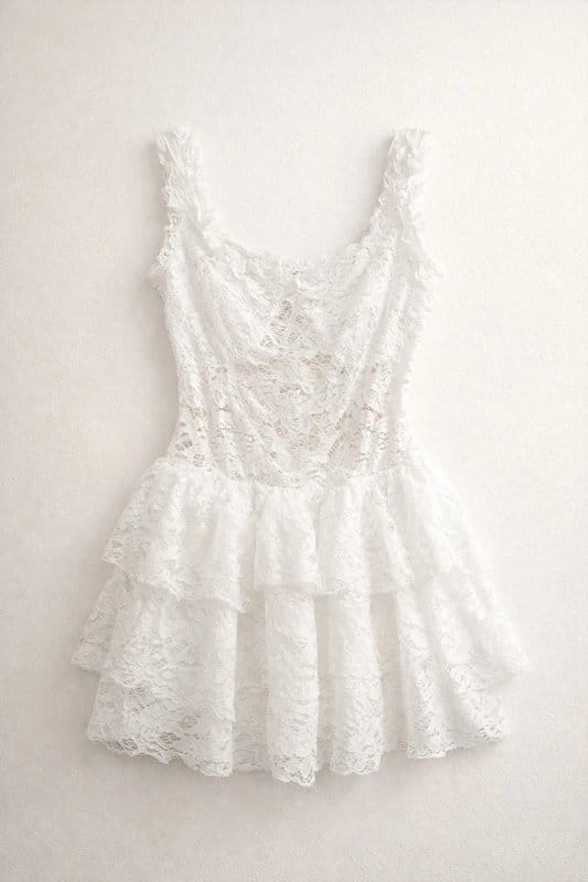 This white lace playsuit features a layered ruffle skirt and delicate sheer lace detailing. The fitted bodice has a soft scoop neckline and offers floaty volume through the skirt. Ideal for holidays, festivals, bridal events, parties, or a soft feminine Y2K look.