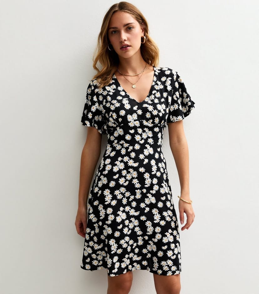 Charming black floral mini dress by Sunshine Soul. Featuring a scoop neckline and short flutter sleeves, this dress boasts a playful floral print and an A-line skirt. Ideal for casual outings or summer events.