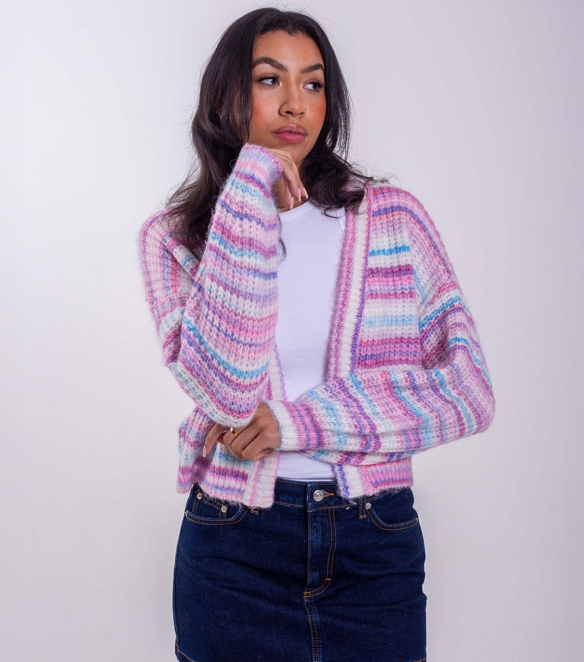 Bright pink striped cardigan with a relaxed fit and dropped shoulders. Perfect for layering over casual tops. Made from a knit fabric for comfort and style.