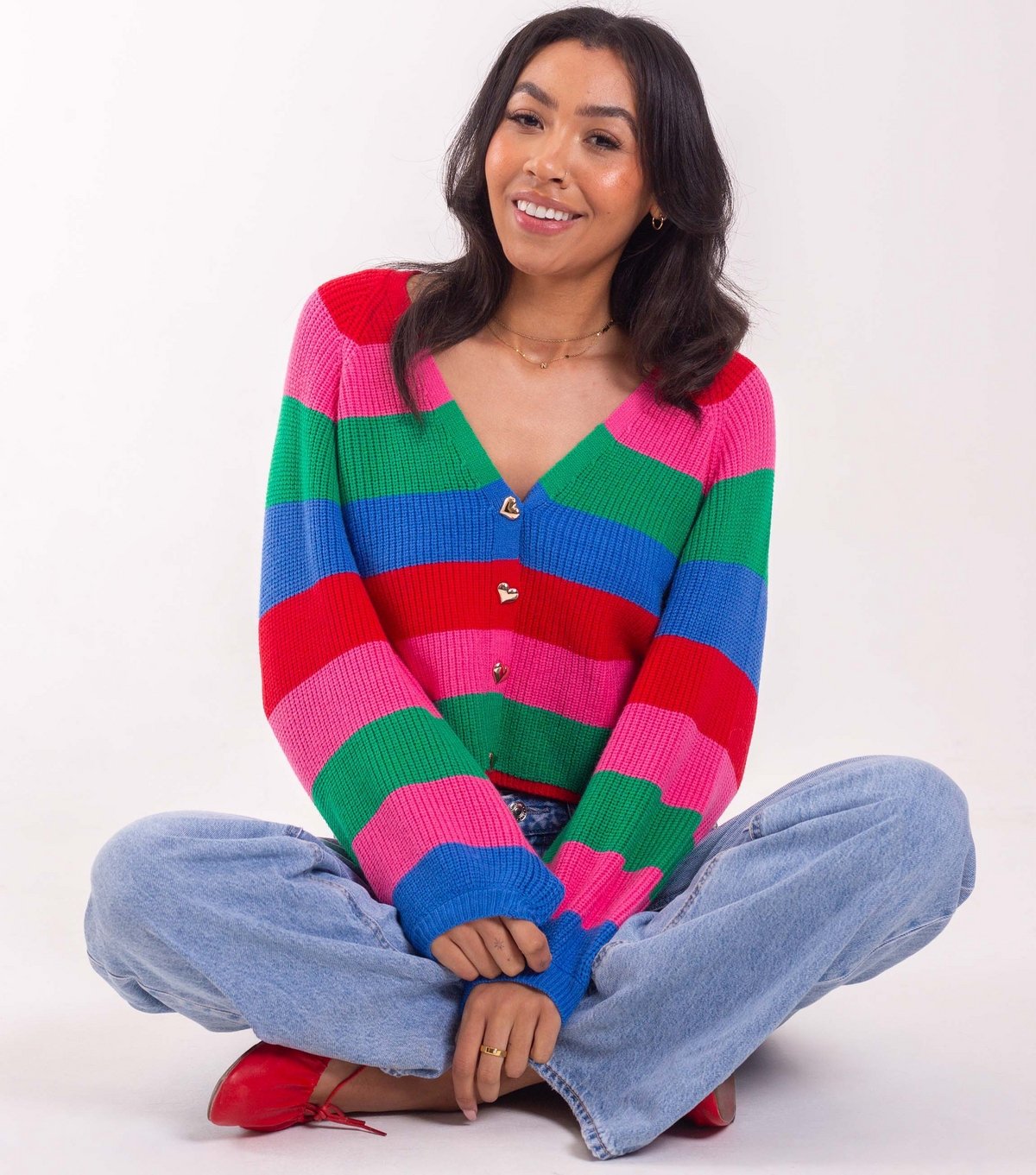 Brighten up your everyday wardrobe with this multi-coloured striped cropped cardigan from Sunshine Soul. Its V-neckline and heart-shaped buttons make it a cheerful choice. Made from chunky knit fabric, it offers a relaxed fit.