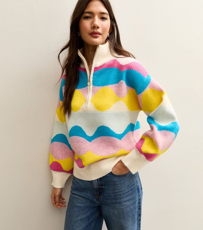 Brighten up your wardrobe with this multicoloured patterned half zip jumper by Sunshine Soul. The playful wave pattern adds a fun and vibrant touch, perfect for casual day dressing.