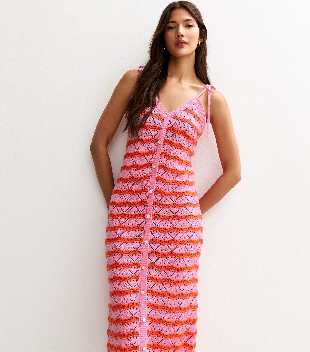 Vibrant midi dress in pink and red scallop stripe featuring a V-neckline and thin tie straps. Made from pointelle knit fabric, it offers a slim fit and ribbed trim for a stylish look. Ideal for casual outings or summer events.