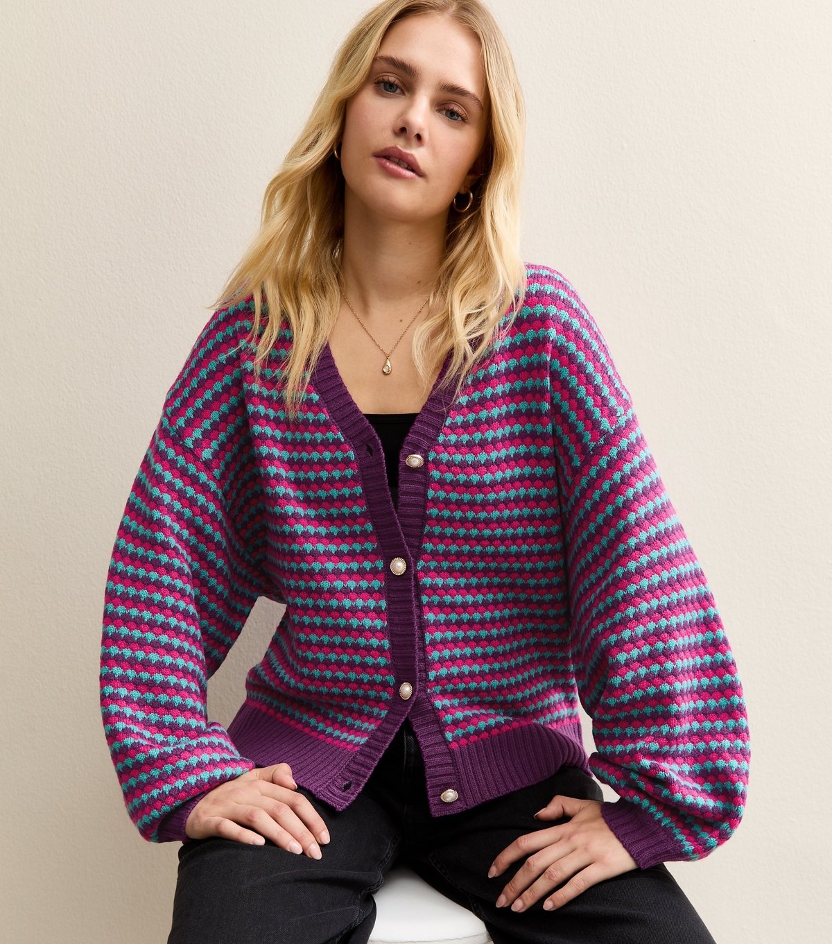 This oversized cardigan from Sunshine Soul features a purple knit with a striped pattern and pearlescent buttons down the front. Ideal for layering, it adds a touch of vibrancy to any outfit.
