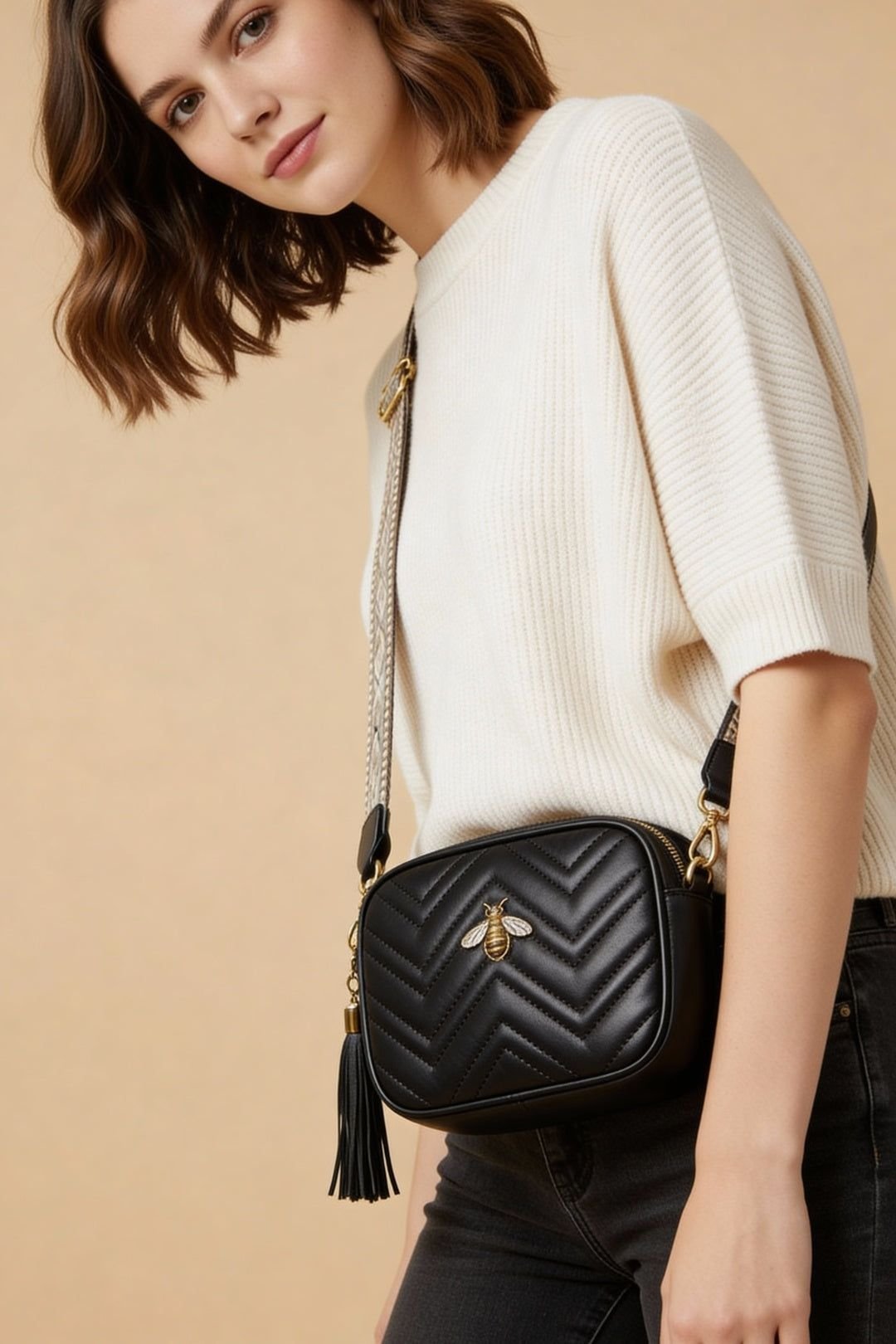 Playful and sophisticated, this black quilted camera bag features a signature bee embellishment and a matching printed strap. Ideal for day-to-day use, it complements any look from casual to chic.