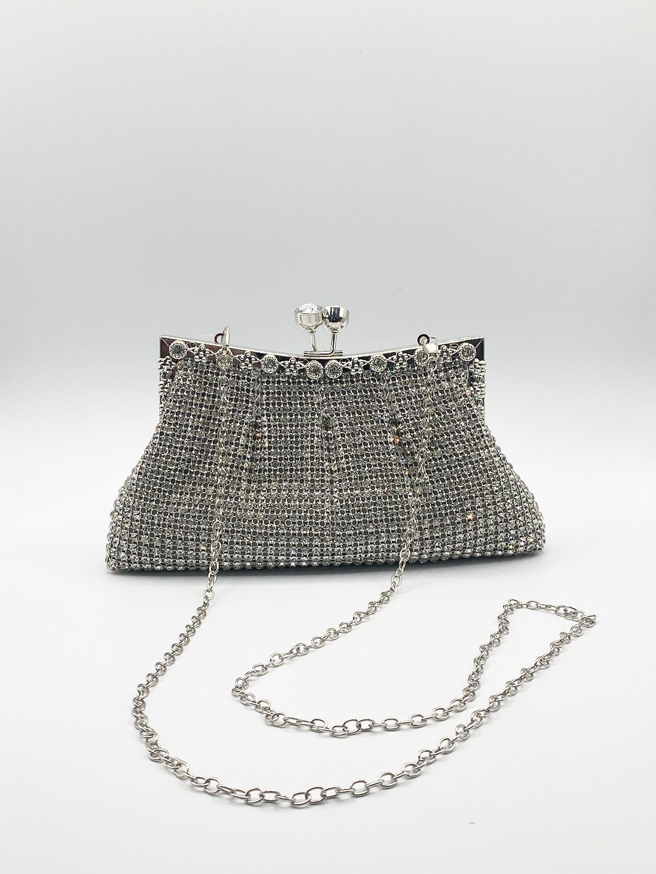 Elegant silver crystal clutch bag by SVNX. Adorned with sparkling rhinestones, this clutch adds a touch of glamour to any outfit. Ideal for evening events and parties.