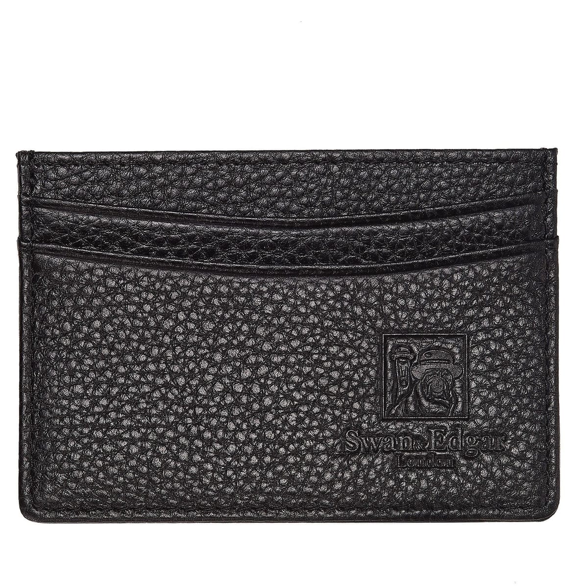 Stylish black leather credit card holder by Swan & Edgar. Features a textured leather exterior and multiple card slots for organisation. Ideal for everyday use.