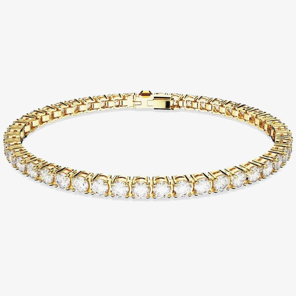 The Swarovski Gold Plated Tennis Bracelet with Crystals is made from crystal, gold-tone metal.
