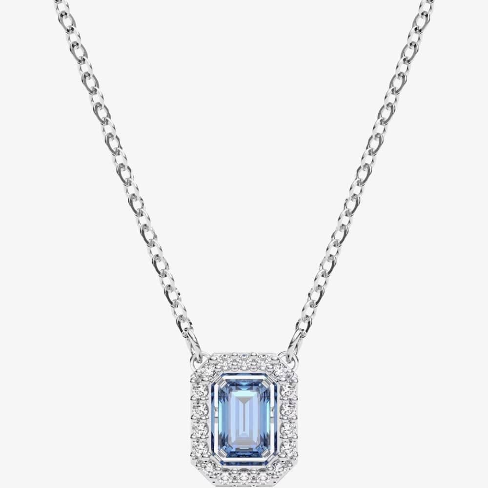 This Swarovski necklace features a captivating octagon-cut blue stone at its centre, surrounded by delicate crystals and set within a rhodium-plated frame. The pendant gracefully moves with your every motion, adding a touch of elegance to any outfit.