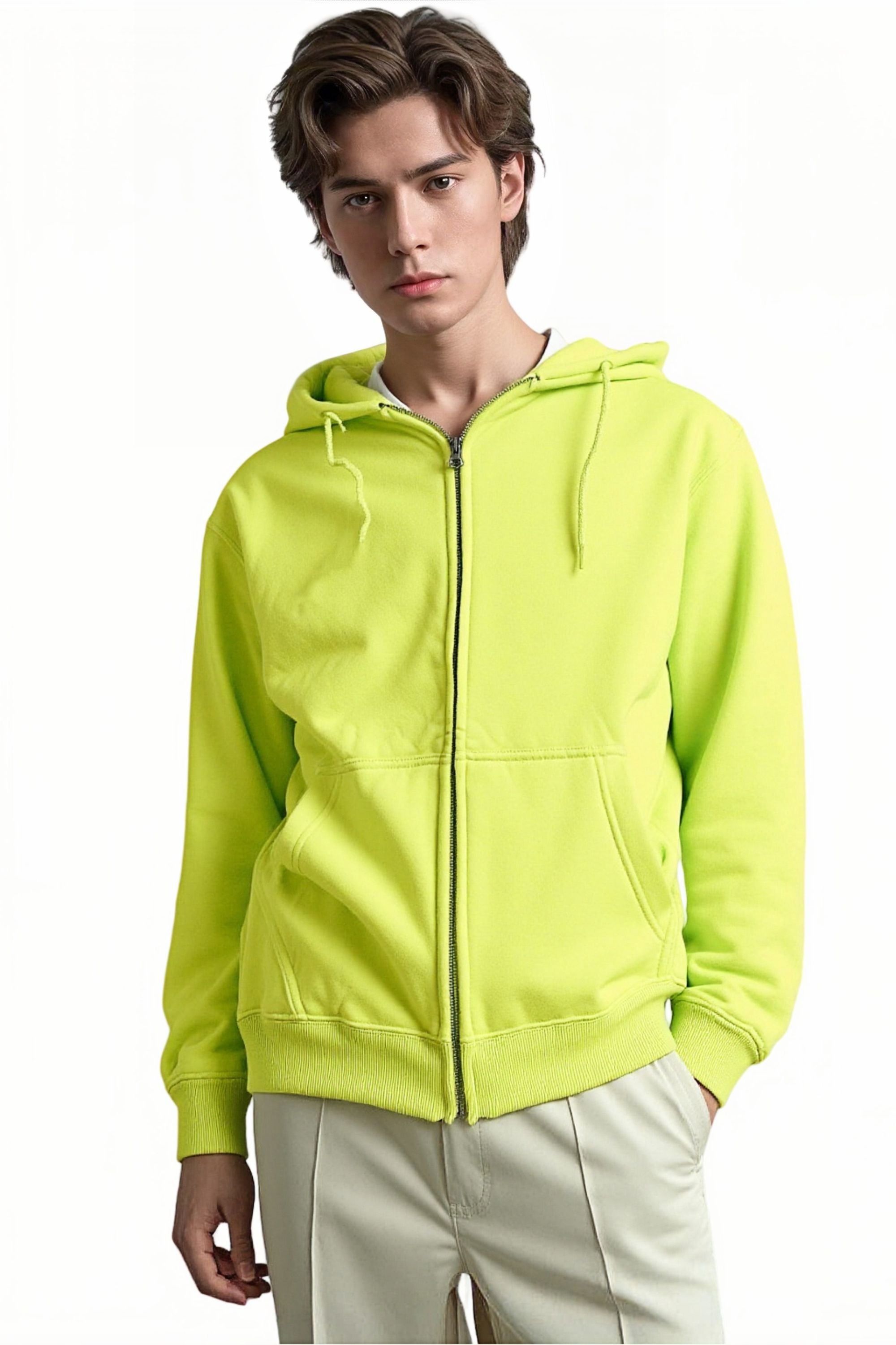 Bright yellow full zip-up hoodie for men, crafted from a comfortable cotton and polyester blend. Features a full zip front, ribbed cuffs and hem, and a drawstring hood. Ideal for casual wear or active days.
