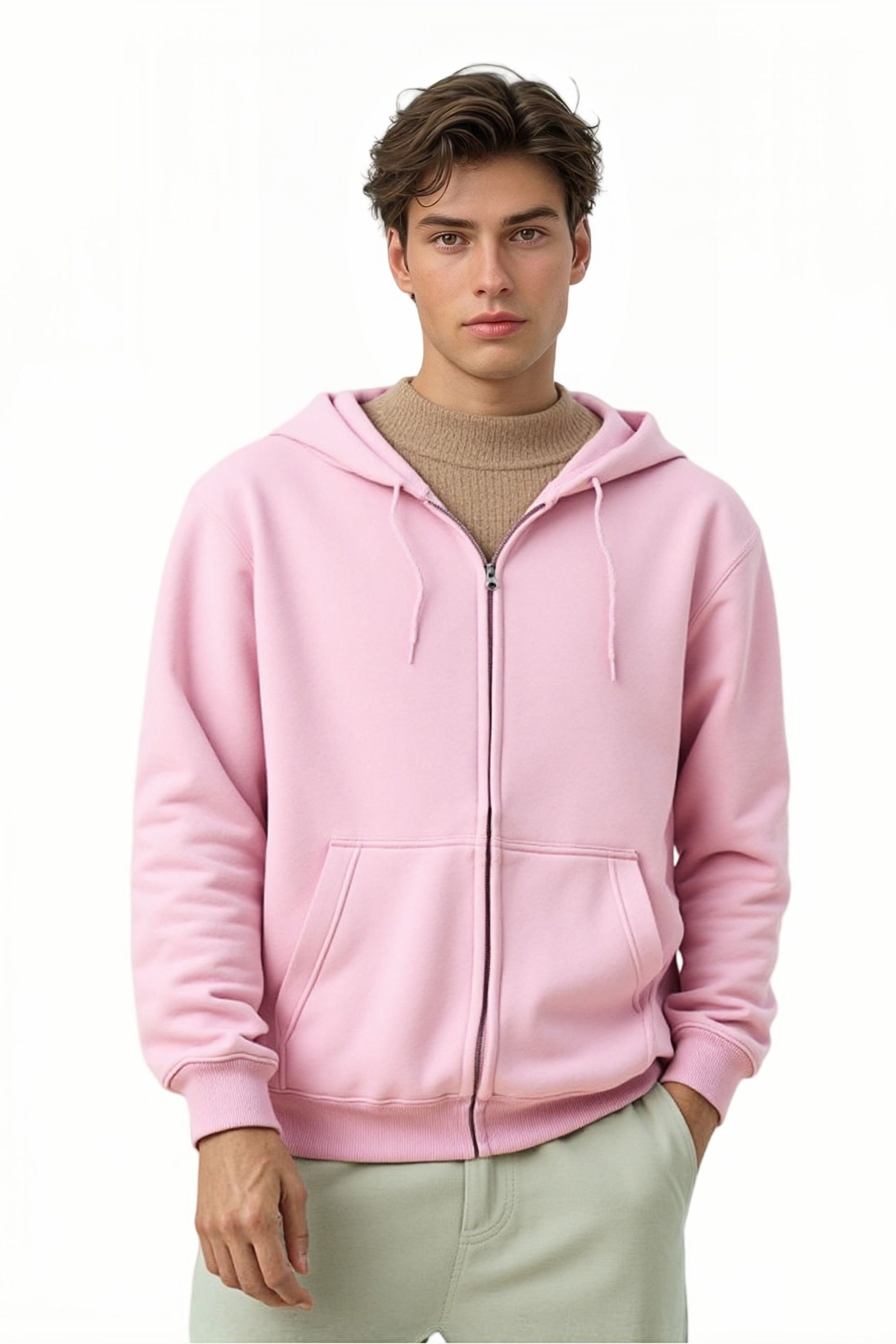 Elegant light pink full zip-up hoodie for men, crafted from a blend of cotton and polyester. Features a full-length zipper, drawstring hood, and two front pockets. Ideal for casual wear or layering.