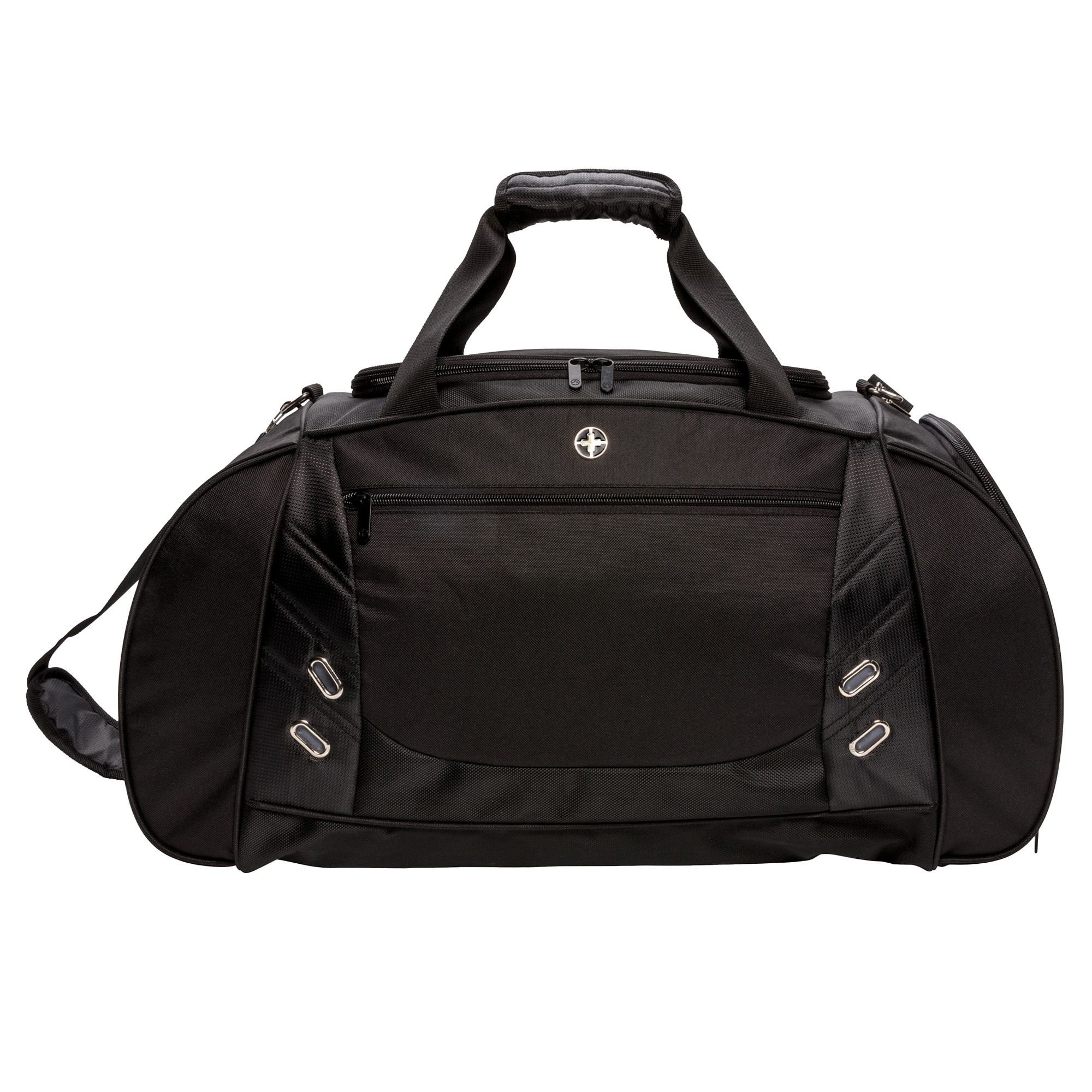 Sleek black polyester sports duffle bag by Swiss Peak. Features a main compartment, zipped sections, and a vented side shoe compartment. Includes a bottle pocket and a front pocket, both zipped. Equipped with an adjustable shoulder strap and carry handles. Dimensions: 61cm x 30cm x 25cm.