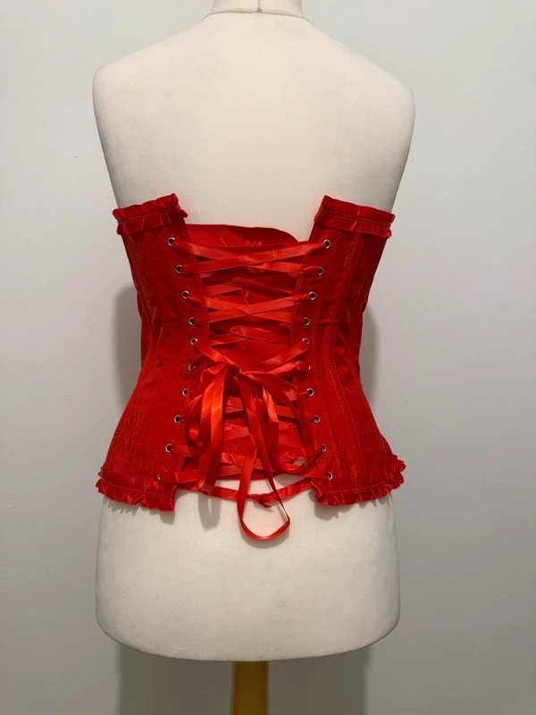 Crafted from striking red satin with a floral jacquard pattern, this corset features a ribbon lace-up back and ruffled trim. Perfect for adding a statement piece to burlesque, gothic, or evening outfits.