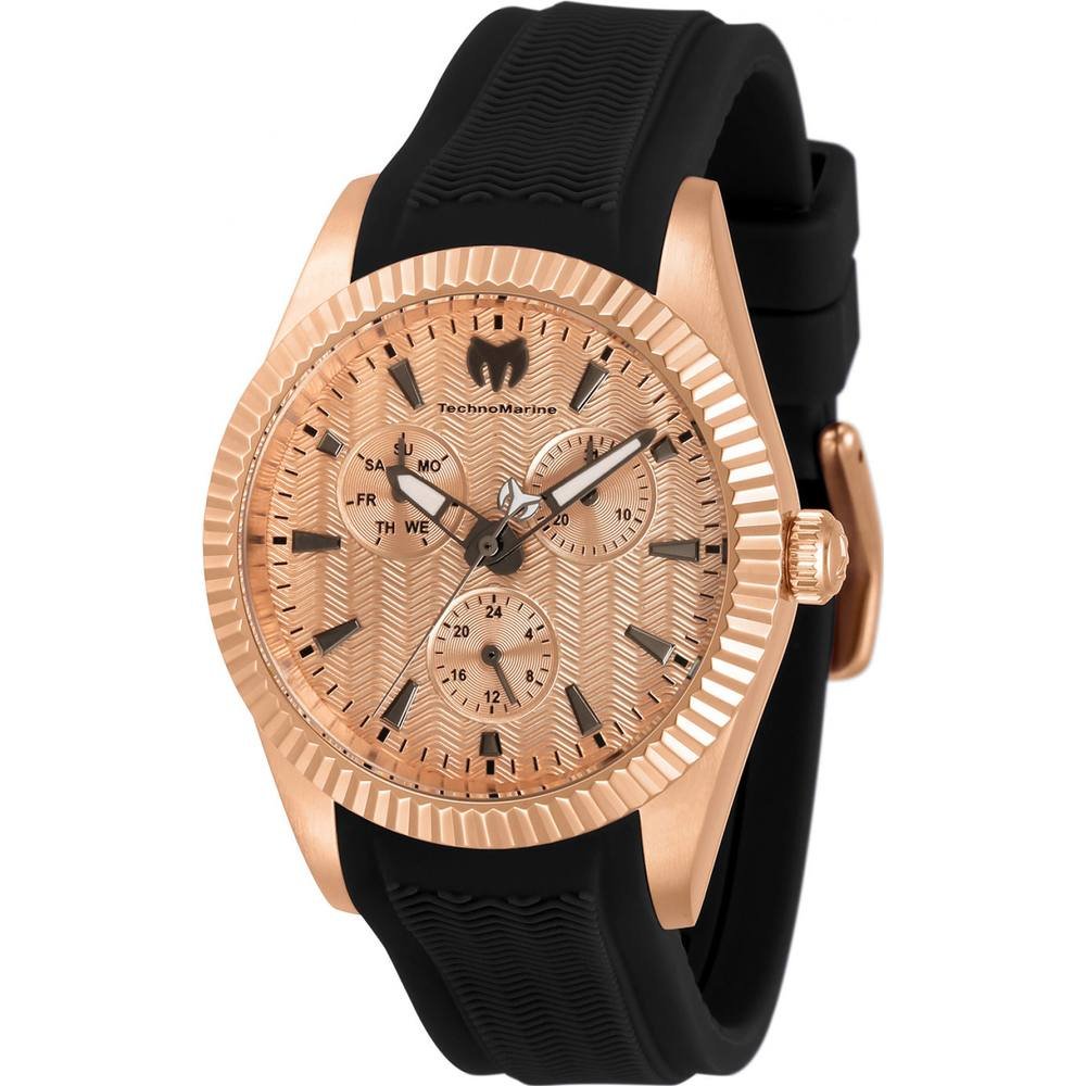 Stylish TechnoMarine watch for women, featuring a black strap and a rose gold-tone dial. The watch has a durable construction and a quartz movement for accurate timekeeping.