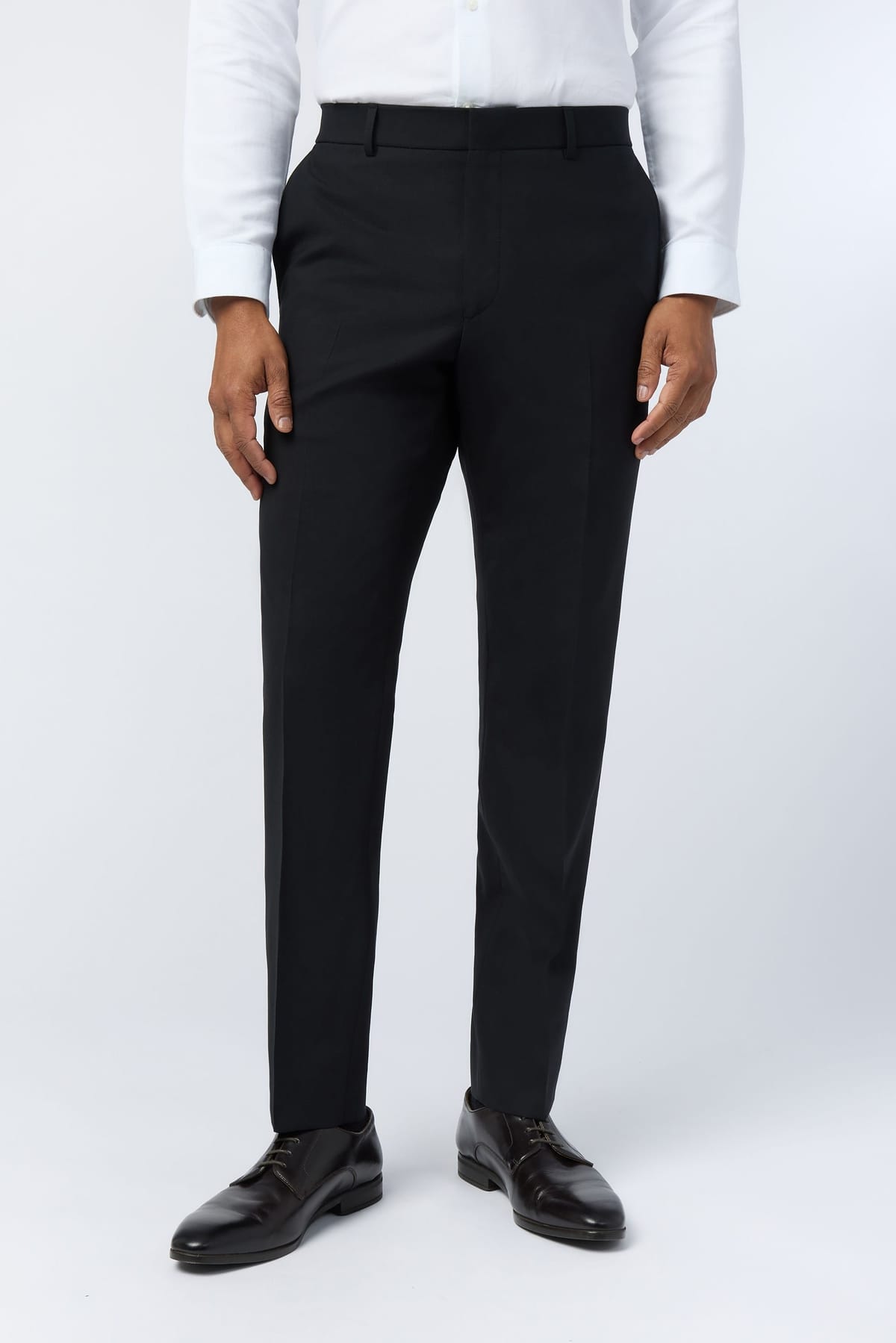 Sleek black slim fit trousers crafted from a rich wool-blend fabric. Designed for a clean, modern look, these trousers feature a performance finish that resists water and stains. Ideal for both professional and casual settings.