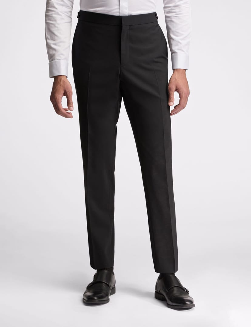 Sophisticated black slim fit trousers crafted from a luxurious wool blend. Designed with button-through side adjusters for a comfortable fit, perfect for any occasion.
