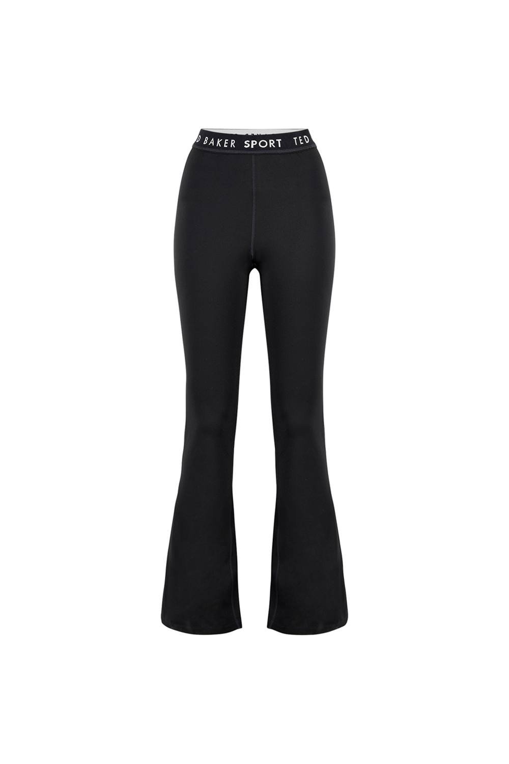 Sleek black flare leggings with a streamlined fit through the thighs and a gentle flare from knee to hem. The Ted Baker Sport waistband adds a distinctive design element. Made from smooth, stretchy fabric for comfort and ease of movement.