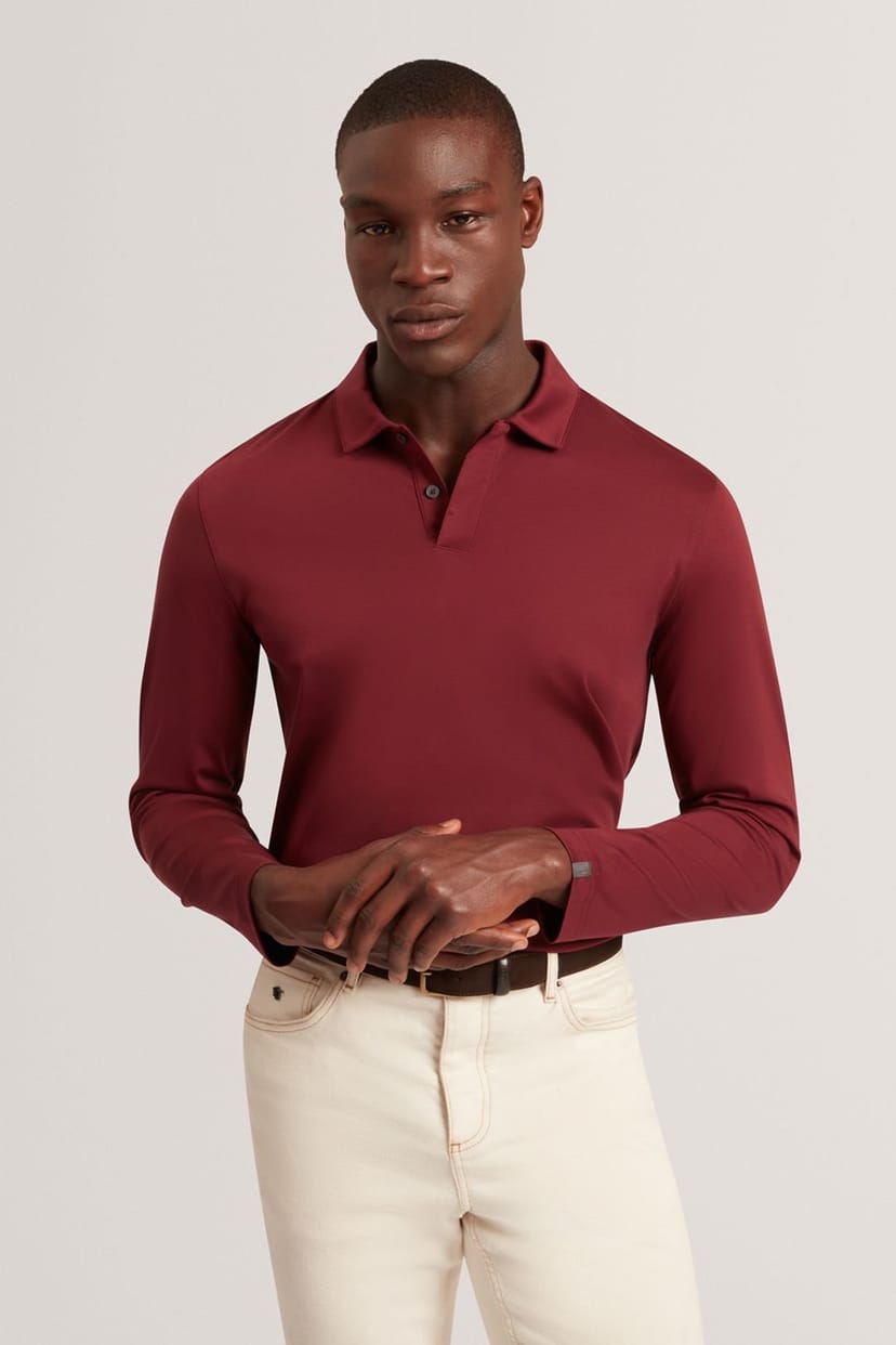 See all outfit ideasSleek maroon long-sleeve polo with a soft-touch finish for exceptional comfort. Features a classic two-button placket and a neat collar for a refined casual look. The subtle Ted Baker branded tab on the sleeve cuff adds a touch of sophistication. Perfect for versatile styling.