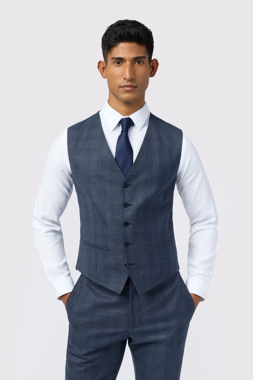 Stylish Navy Check Waistcoat by Ted Baker. Crafted from a textured fabric, this waistcoat features a slim fit and check pattern. Ideal for formal occasions or smart-casual ensembles.