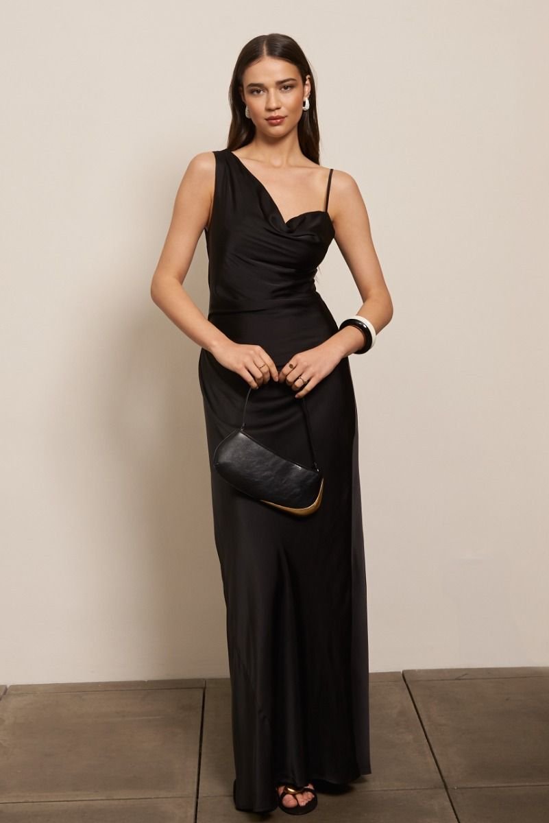 Stylish black one-shoulder maxi dress with spaghetti straps and a flowing silhouette. Perfect for evening events or formal occasions.