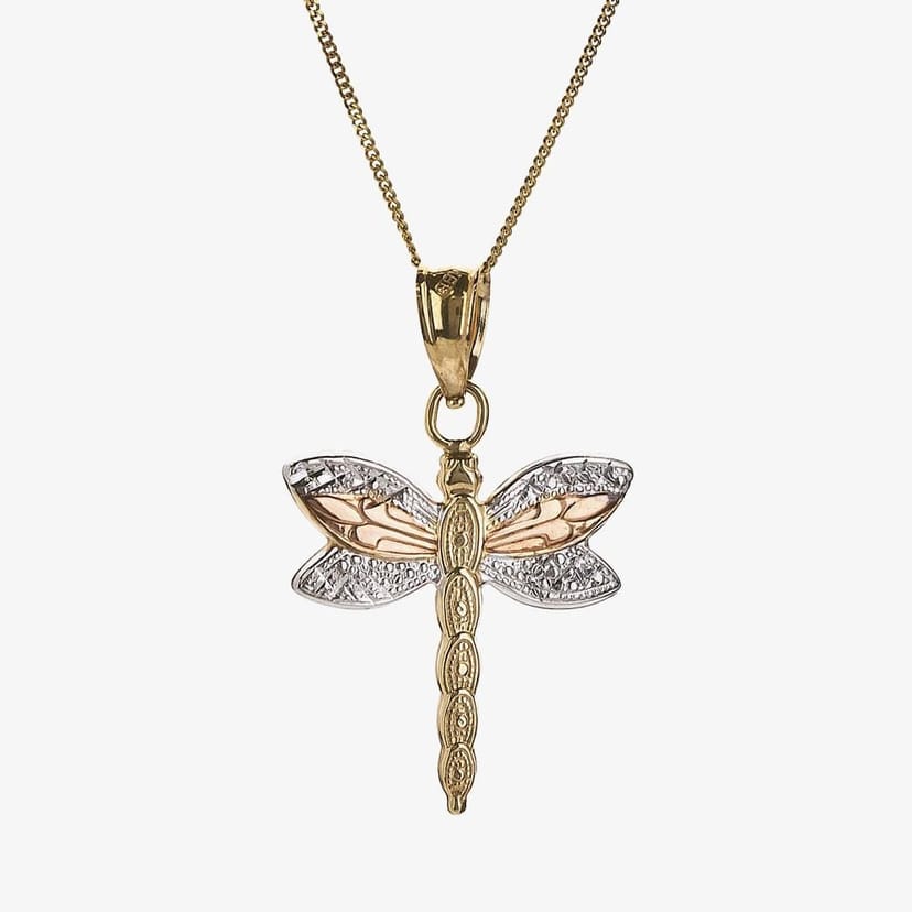 Elegant gold dragonfly pendant from T.H.Baker, featuring a three-colour design with intricate detailing. A glamorous addition to any jewellery collection.